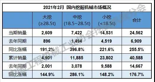 据中国工程机械工业协会统计数据显示,2021年2月,纳入统计的26家主机制造企业共计销售各类挖掘机械产品28305台,同比涨幅205.0%。其中,国内市场销量24562台,同比涨幅255.5%;出口销量3743台,同比涨幅57.9%。